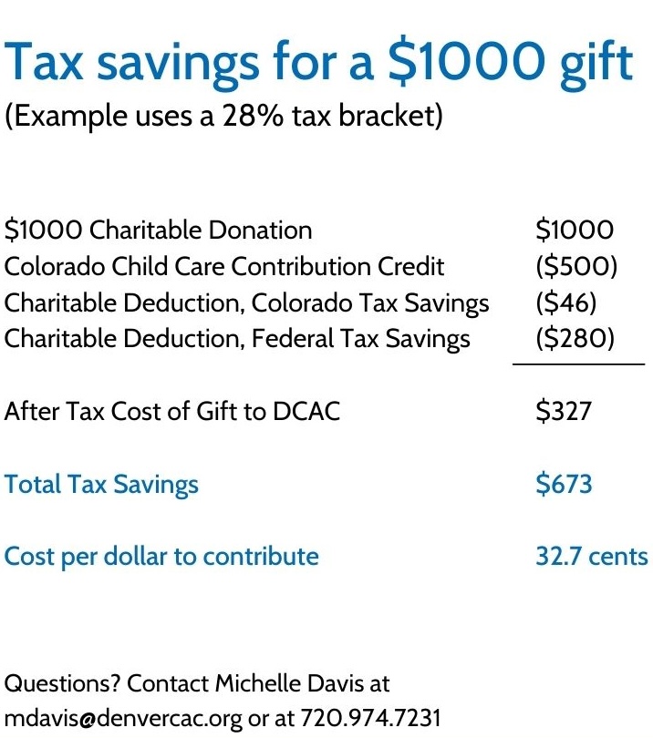 Questions? Contact Michelle Davis at mdavis@denvercac.org. Donate today at https://www.denvercac.org/coloradochildcarecontributioncredit/!